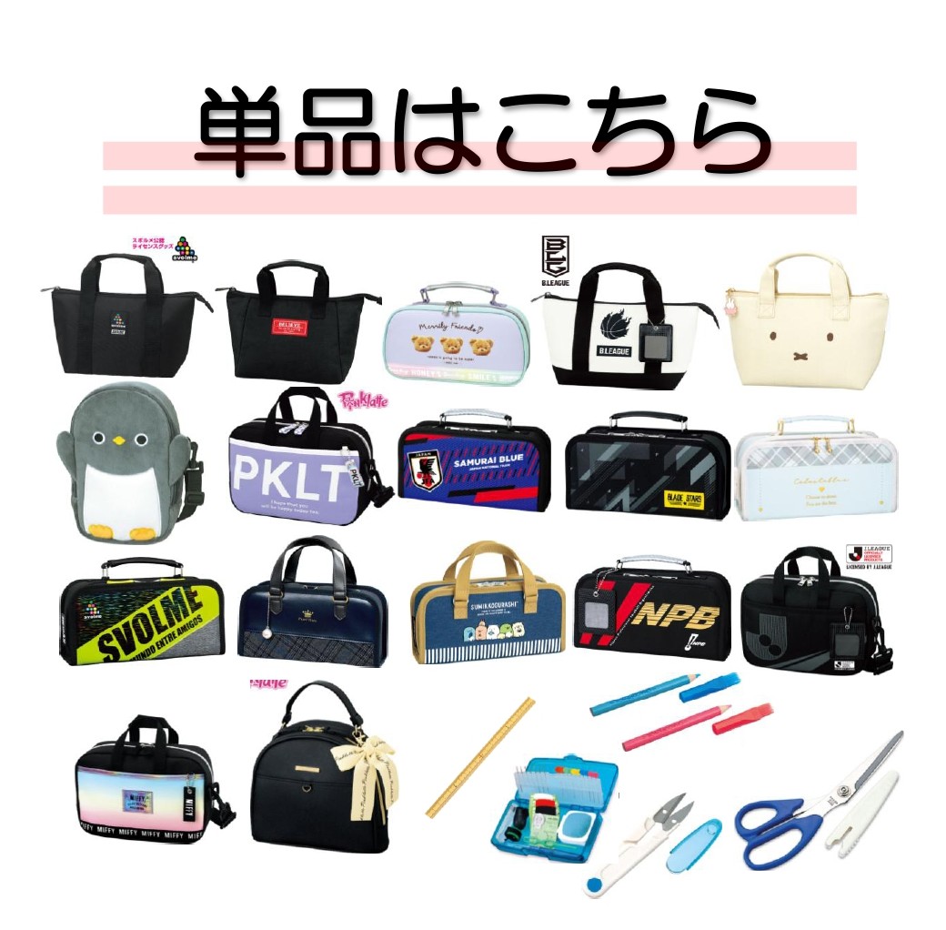 | 種類 | 【A369】T-S.トート・スボルメ, 【A368】T-B.トート・ブラック, 【A596】U.テディベア, 【A370】T-L.トート・Bリーグ, 【A371】T-M.トート・ミッフィー, 【A601】Q.バンザイ☆ぺんぎん, 【A223】R.ピンク ラテ・ラベンダー, 【A600】W.セレストブルー, 【A598】J.サムライブルー, 【A522】E.すみっコぐらし, 【A521】V.ブレイドブラック, 【A265】M.ミッフィー・オーロラ, 【A266】F.Jリーグ, 【A595】S.スボルメ, 【A593】H.パール・ティアラ, 【A599】K.プロ野球 12球団・ネオ, 【A597】A.ピンク ラテ・リボン, 【A060】12.リッパー, 【A071】2.ニードルボックス, 【A072】3.チャコペンシルM 2本組, 【A058】11.竹尺 20cm, 【A031】5.糸切りばさみ≪右用ブルー≫, 【A032】6.糸切りばさみ≪左用グリーン≫, 【A026】7.たちばさみ≪右用ブルー≫, 【A027】8.たちばさみ≪左用グリーン≫ |
